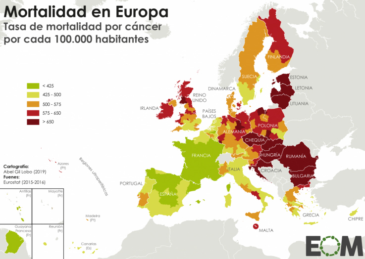 Spanien er et af de land med den laveste dødelighed pr. 100.000 indbyggere. I de fleste landdistrikter er der under 425 dødsfald pr. 100.000 indbyggere, hvilket vil sige 0,4 procent.