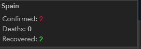 Her kan man se, at ingen er døde i Spanien og to er helbredte, hvilket jo er positivt - selvom den røde prik forbliver på landkortet.