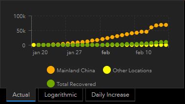 Ved at klikke i ‘Daily Increase’ ses udviklingen af smittede, siden udbruddet blev kendt. Netop her ses det høje tal på den 13. februar, som nogle medier blæste op, men som skyldes en ændring i diagnosticeringen. Det fremgår også, at udviklingen i de efterfølgende dage nærmest faldt til under hidtidigt niveau.