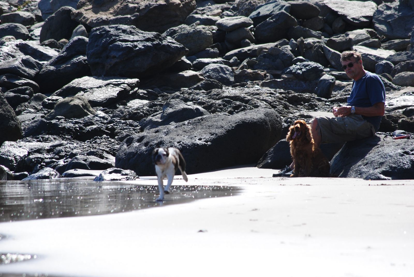 Lars på hundestranden med Tulle og Galy