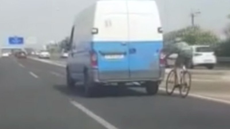 VIDEO: Vandvidscyklist kom op i motorvejs-hastighed ved at hægte sig på varevogn.
