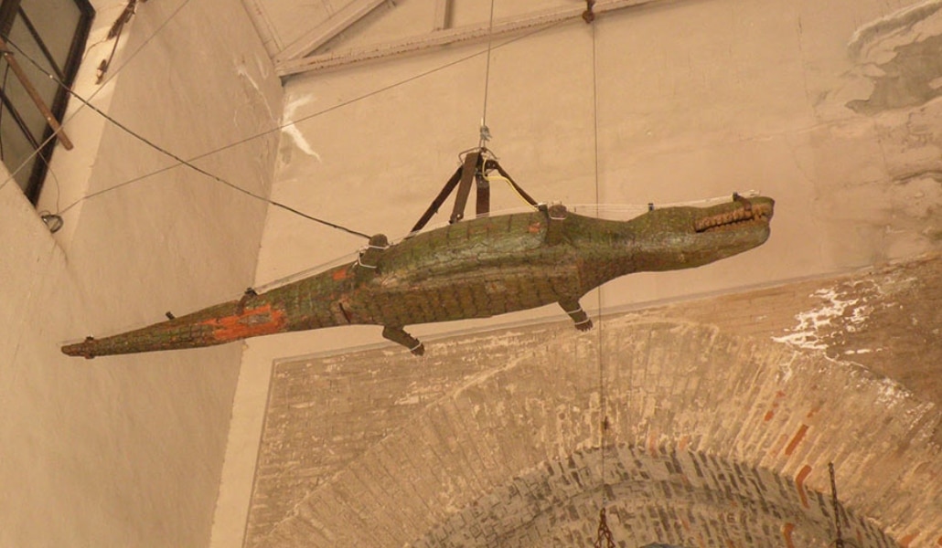 Da den udstoppede krokodille efter nogen tid rådnede, besluttede man i 1500-tallet at lave en tilsvarende model i træ.