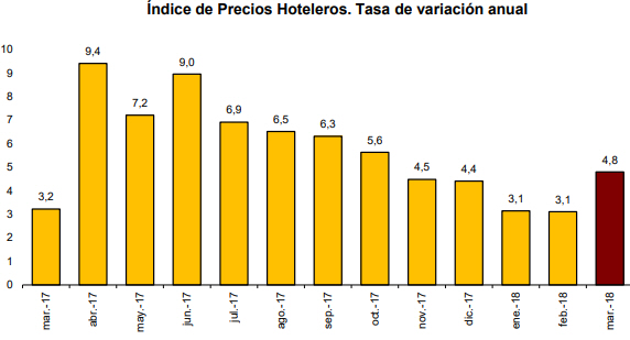 Gennemsnitslængden for et ophold faldt med 1,4 procent i forhold til marts 2017 og lød på 2,9 overnatning per rejsende.