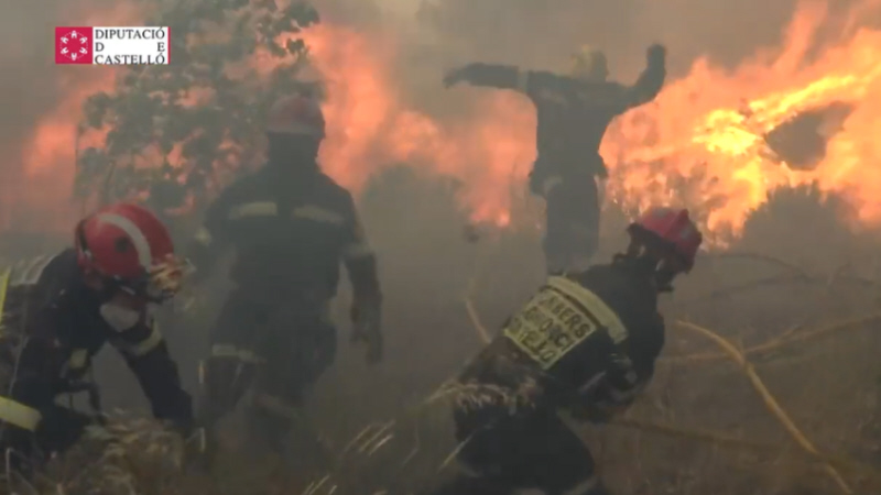 Tre brandmænd og mindst 20 passagerer på toget til Zaragoza såret i Bejís-branden, der er helt ude af kontrol på grund uventet ændring af vindretningen.