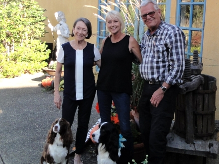 Vores møde med Marimar skulle også foreviges med et billede. Her Marimar, Pernille, jeg selv og hundene Chico og Bonita, der også har lagt navn til flere af vinene
