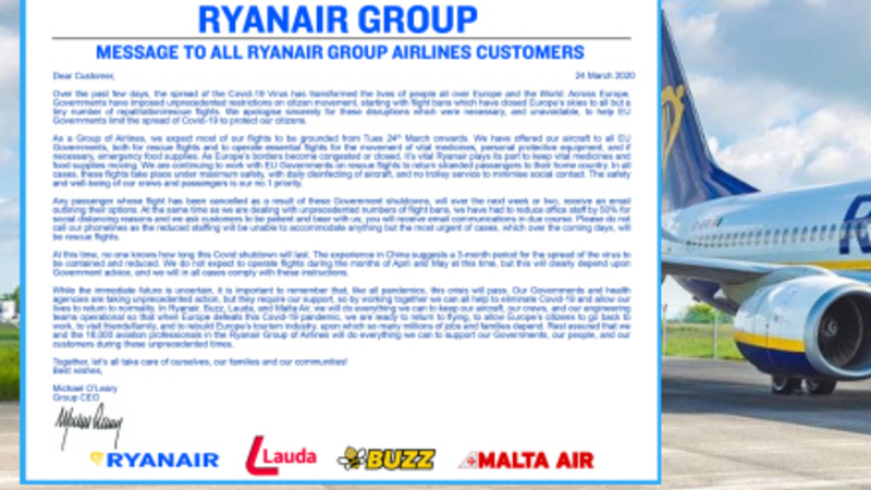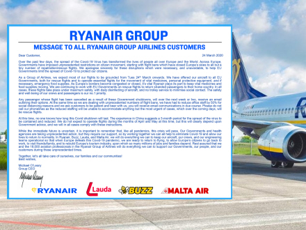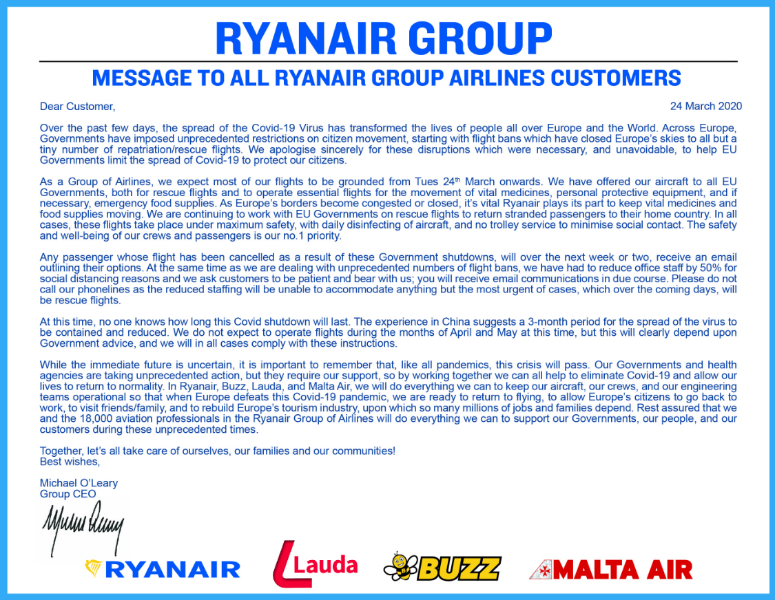 ”Når Europas grænser bliver overbelastede eller lukkede, spiller Ryanair sin vigtige rolle for at opretholde transporten af vitale lægemidler og fødevareforsyninger” oplyser O'Leary og skriver videre: