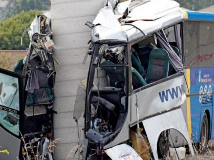 Klokken 13:40 i går kørte en bus af vejen, gennem autoværnet og hamrede frontalt sammen med en cementsøjle.