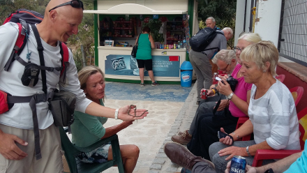 Efter udgang var det tid til en forfriskning, inden bussen kørte tilbage til kysten efter en forrygende naturoplevelse. Her sidder en del af holdet ved kiosken, men der findes også barer og restauranter i området.