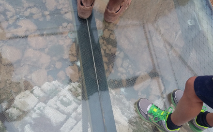 Efter at man har tilbagelagt cirka to-tredjedele af turen, kommer svendeprøven. En armeret og meget solid glasplade er lagt ud som en lille platform. Herfra kan du kigge direkte ned i dybet - hvis du tør.