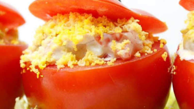 Tomater kan fyldes med et væld af ingredienser, men det er sådan, jeg husker dem som min mor lavede dem. De var dog uden krabbe pinde, som er min egen opfindelse. Du vil helt sikkert kunne lide dem.