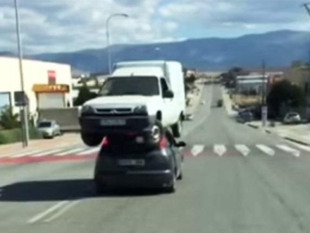 Sådan råber den bilist, der filmer en bilist, der i en Ford Focus transporterer en Renault-varevogn på taget i et industriområde. Formentlig i Segovia.