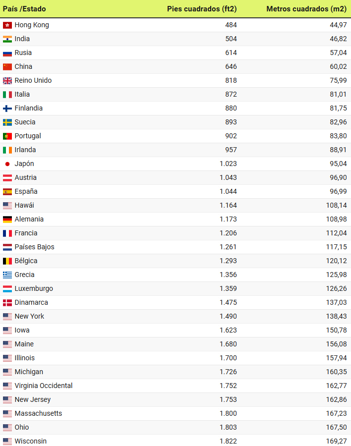 Boligsitet Idealista.com bringer et kort, som viser, at praktisk talt alle amerikanske stater overstiger 130 m2 i gennemsnit, og de er dermed langt foran samtlige europæiske lande. På kortet er målene angivet i fod, mens tabellen nederst i denne artikel viser det i m2.