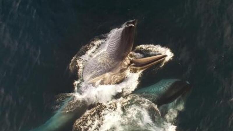 Med en drone har man fanget finhvaler, der er i gang med at spise i overfladen ud for den catalanske kyst. Det er første gang giganterne er blevet fanget af en drone der.