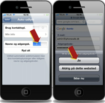 Aktivér navne og adgangskoder, og svar JA, når Safari spørger, om den skal gemme for dig