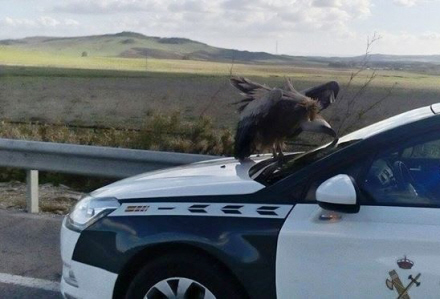 Kæmpestor gåsegrib landede på kølerhjelmen af en Guardia Civil-bil. Og dér blev den siddende.