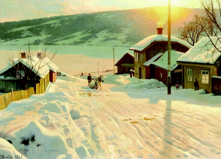 4) Peder Mønsted: Vinterdag i Lillehammer. Sign. P. Mønsted 1916. Olie på lærred. 41 x 56. Vurdering: 40.000-50.000 kr. Hammerslag: 120.000 kr.