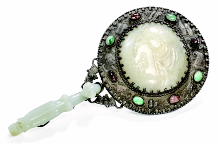 3) Kinesisk håndspejl med repoussee kant af sølv med buddhistiske symboler i relief og indlagt med turmalin carbochon og jadeit, med udskåret plakette af hvid jade med fersken og langlivssvamp. Håndtag af udskåret jade i form af bæltespænde. Ca. 1900. L. 21,5 cm. Vurdering: 30.000-40.000 kr. Hammerslag: 65.000 kr.