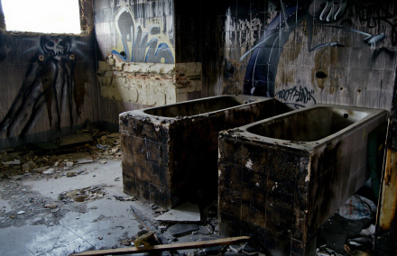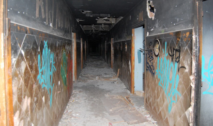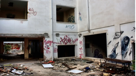 Bygningen er snavset, den er fyldt med graffiti og skrald.