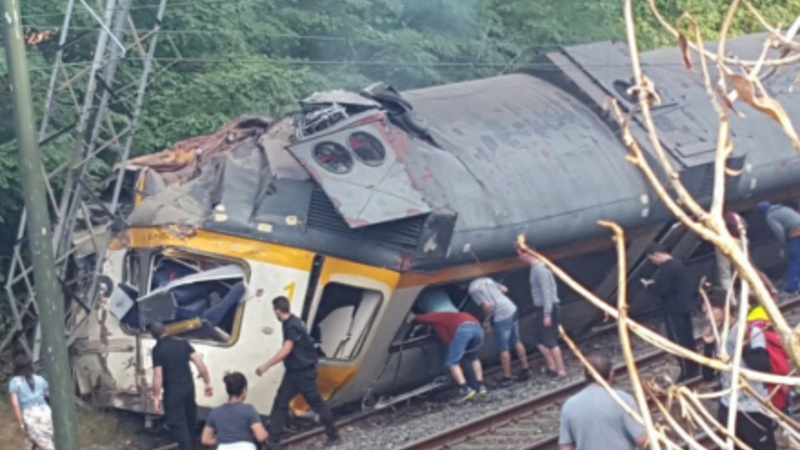 Toget, der var på vej til Porto i Portugal fra den spanske by Vigo, ramte tilsyneladende en bro, som det kørte under, hvilket fik toget til at afspore lige før en station.