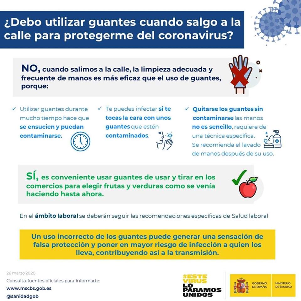 Faktisk kan handsker ved længere tids brug både bære virus og bakterier, som så kan smitte ved berøring. Så hellere gøre, som eksempelvis LIDL og Mercadona opfordrer til nemlig at tage engangshandsker på, når man går ind i butikken, og så tage dem af igen, når man går ud.
