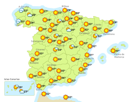 Sommerens tredje hedebølge er over os med høje temperaturer på de indre og sydlige egne af halvøen samt i Ebro-dalen. Hele 18 provinser er i forhøjet alarmberedskab på grund af de høje temperaturer.