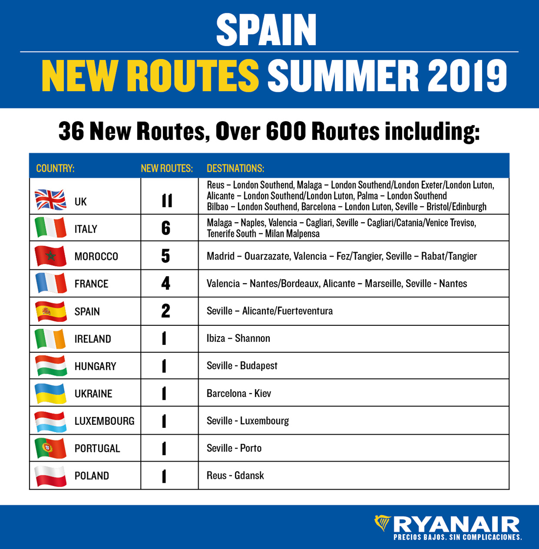Ryanairs nye spanske ruter - klik på billedet for at gøre det større