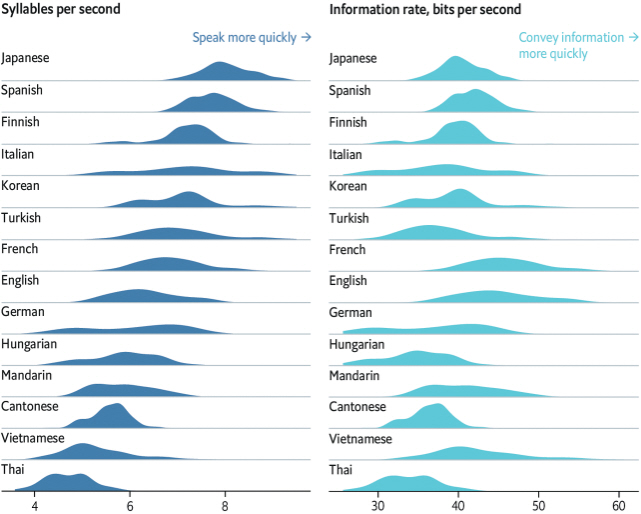 Fænomenet her er genstand for ny forskning, der viser, at sprog veksler mellem kompleksitet og hastighed. Dem, der er fyldt med information, taler langsommere, mens mindre komplekse tales hurtigere. Som et resultat er de fleste sprog lige effektive til at formidle information.