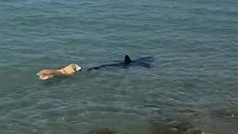 Hund får øje på en haj, springer i havet og indleder fangeleg