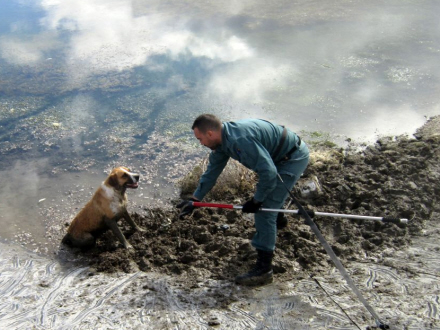 Hunden lå ubevægelig og helt udmattet i et mudret område, hvor den forgæves havde forsøgt at komme ud.