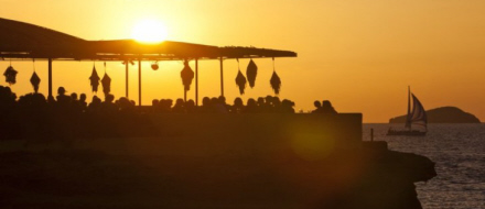 Solnedgang på en strandbar i Sant Antoni