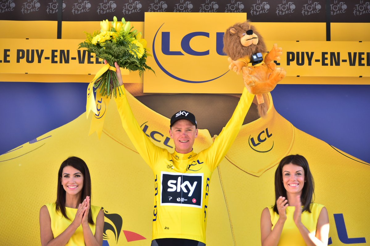 Christopher Froome fejrer den gule trøje med podiepigerne i årets Tour de France (foto: Twitter - @LeTour)