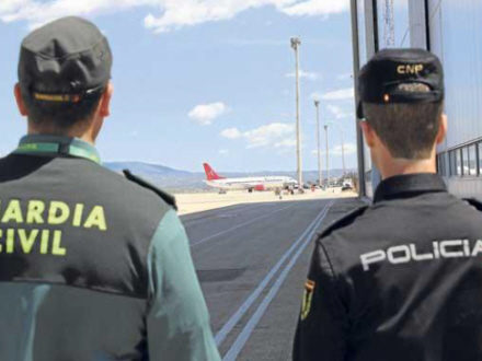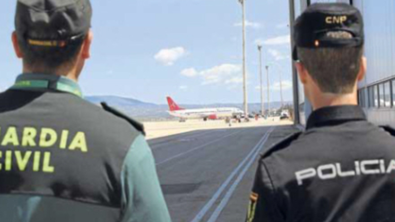 To betjente fra Guardia Civils særlige enhed for lufthavnssikkerhed 'Oficina de Análisis e Investigación de Seguridad Aeroportuaria' bordede flyet for at tjekke, at alt var, som det skulle være.