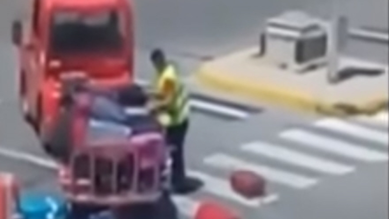 Passagerer på flyet har fortalt, at bagagemanden ganske enkelt så rødt, da store dele af hans last faldt af vognen og trillede ud på asfalten.