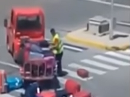 Forfærdede flypassagerer kunne i går fra deres sæder overvære, hvordan en ansat i lufthavnen på Ibiza fuldstændig tabte taktstokken, da en stor bunke kufferter væltede af hans bagage-vogn.