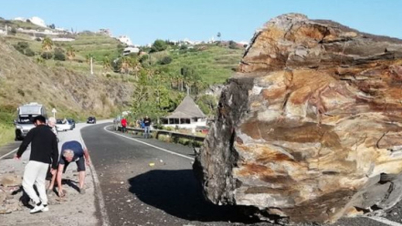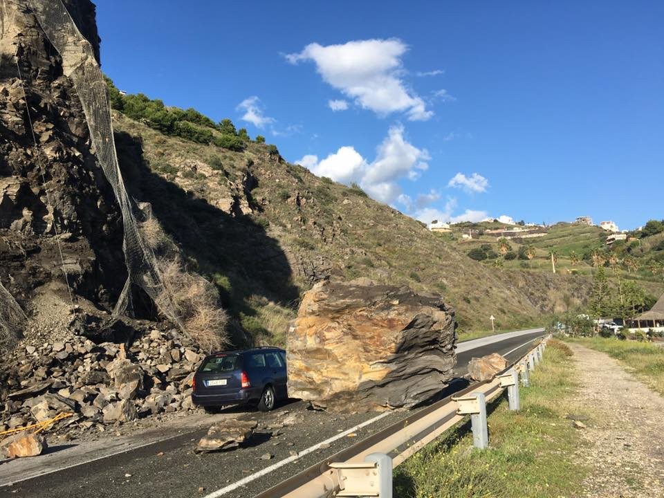 VIDEO: Tonstung sten vælter ned på Kystvejen ved Nerja og lukker for al trafik. Det er et sandt mirakel, at ingen kom til skade.