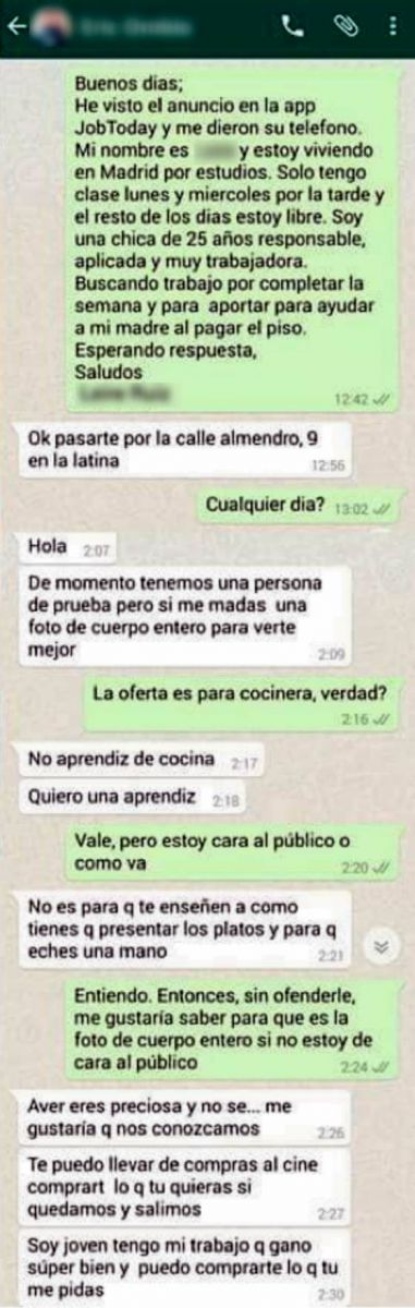 I en række WhatsApp-beskeder, der er blevet delt vidt og bredt på internettet, kan man læse med i, hvordan en af kokkene på en restaurant i Madrid går fra passende til upassende på et par sætninger.