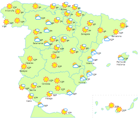 I dag vil et højtryk over halvøen og på Balearerne give ret stabilt vejr med masser af sol og generelt uden nedbør.