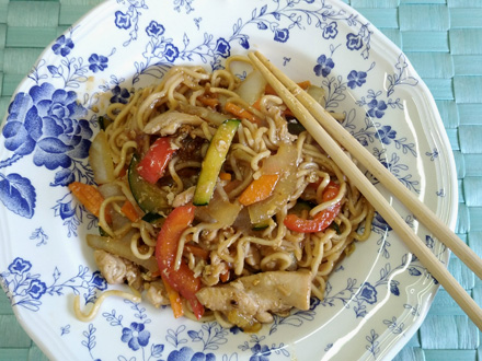 Denne orientalsk-inspirerede ret er meget sund og velsmagende. Samtidig meget alsidig og den kan tilpasses vores smag og andre tilgængelige ingredienser: kylling, oksekød, rejer, krabber eller endda stykker af soja eller sojabønneost for at gøre det helt vegetarisk. Grøntsagerne kan også variere afhængigt af, hvad vi har i køleskabet. Også hvedenudlerne kan ændres til eksemplev: ris- eller majsnudler.