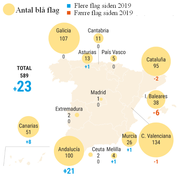 Spanien har i alt 688 blå flag fordelt på 589 strande, 98 lystbådehavne og fem badesteder. Flest finder vi i Valencia Regionen, men den mest markante stigning finder vi alligevel i Andalusien, hvor man med 21 nye blå flag denne sommer rammer et stor og rundt 100.