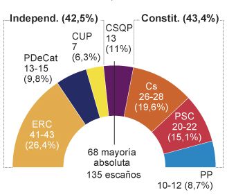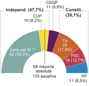 Som det ses er 47,7 procent løsrivere (Indepent.) og 39,1 procent konstitutionelle (Constit). Absolut flertal (mayoria absoluta) er 68 og i alt er der 135 medlemmer (escaños)