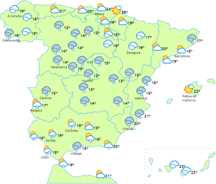 På halvøen og De Baleariske Øer ventes letskyet himmel, mens der bliver mere skyet i sydvest og nordvest med noget spredt, let nedbør.