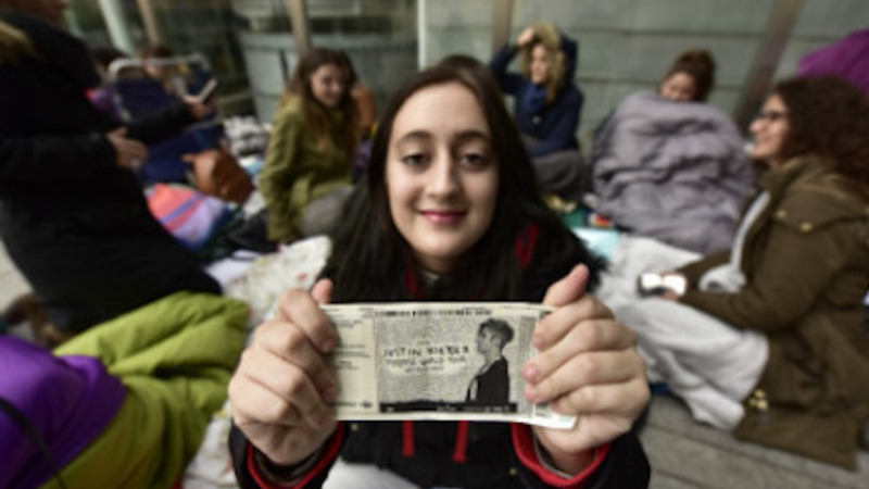 Pakket ind i en stor, brun frakke og med et tæppe over benene sidder hun omgivet af andre Beliebers med kufferter, tasker, soveposer, mad og andet. Et par af de særligt velforberedte har taget telt med, men det er nu de færreste.