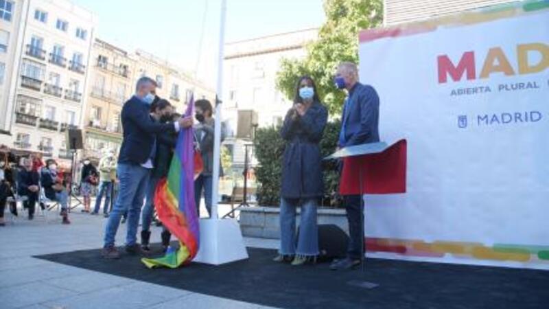 Madrids viceborgmester Begoña Villacís deltog søndag formiddag i hejsningen af LGTB+flaget på Pedro Zerolo-pladsen.