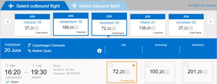 Både priserne og afgangstidspunkterne er jo vigtige og for at give ekesempel valgte jeg en udrejse den 20, juni fra København