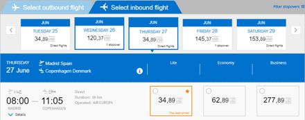 Afgang Madrid 8:00 med ankomst København 11:05. Billetpris mellem 34,89 euro og 277,89 euro afhængig af billettype + det sædvanlige