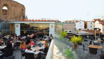 Gaudeamus Caféen ligger på toppen af Escuelas Pías i en bygning, der oprindeligt var et universitet.