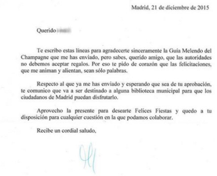 Som borgmesteren skrev i sit afslag, har hun valgt at sende bogen til et bibliotek i Madrid, så alle byens borgere kan få gavn af champagne-guiden.