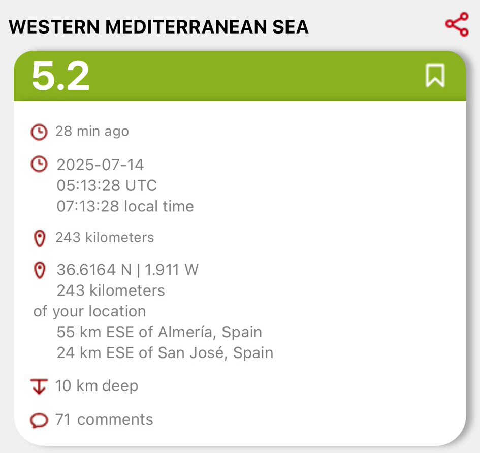 Epicentret lå omkring 32 kilometer fra Níjar og knap 250 kilometer fra Málaga.