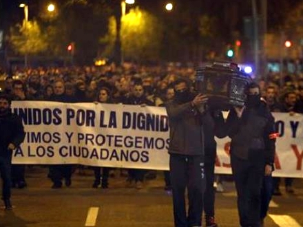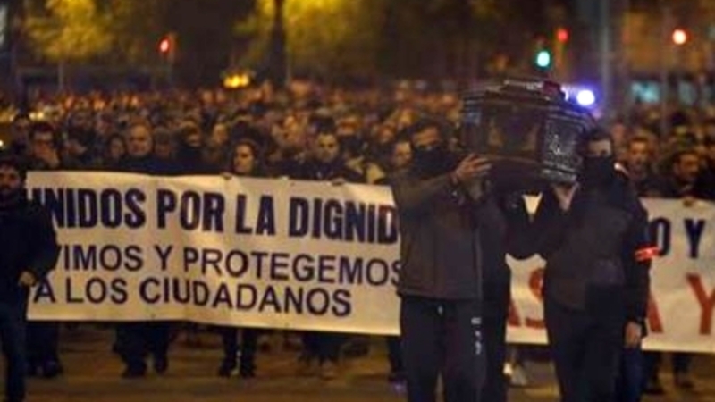 Protestmarchen, der var sat i gang af nogle forskellige politiforbund, startede klokken seks om aftenen på Plaza de la Unvisitat. Betjente bar en kiste, hvorpå der lå forskellige slags politikasketter.