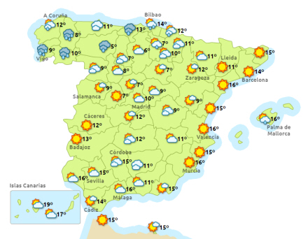 Vejret i Spanien, lørdag klokken 14:00